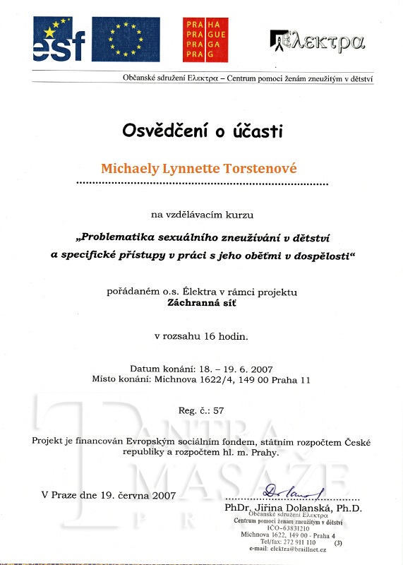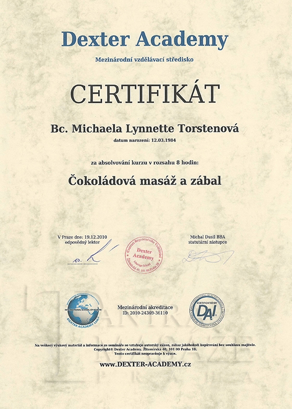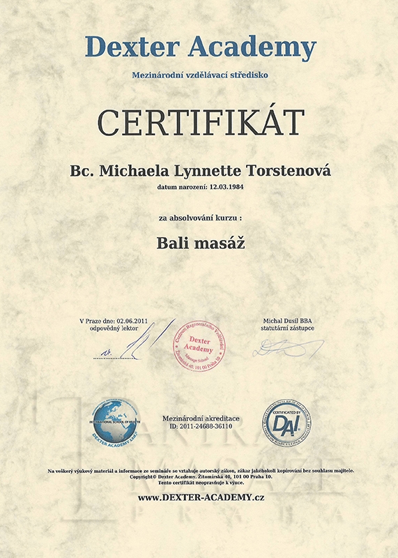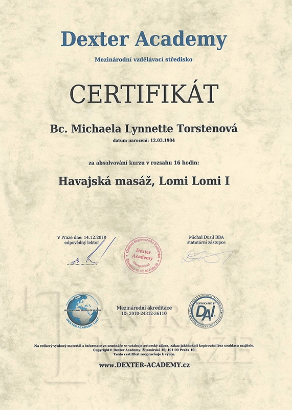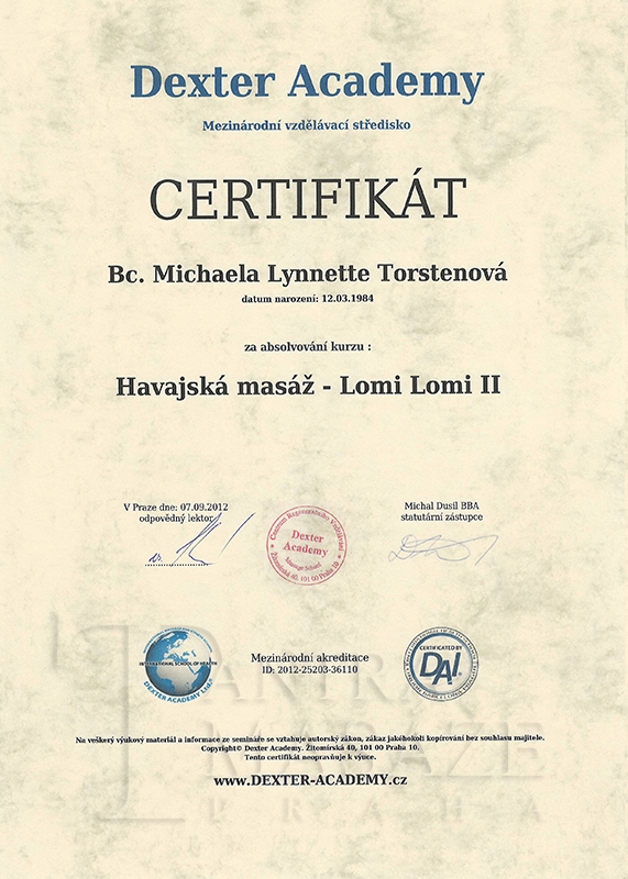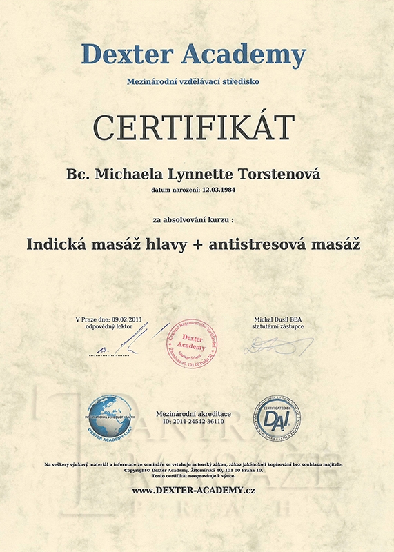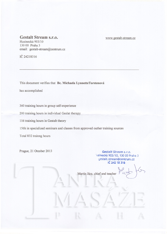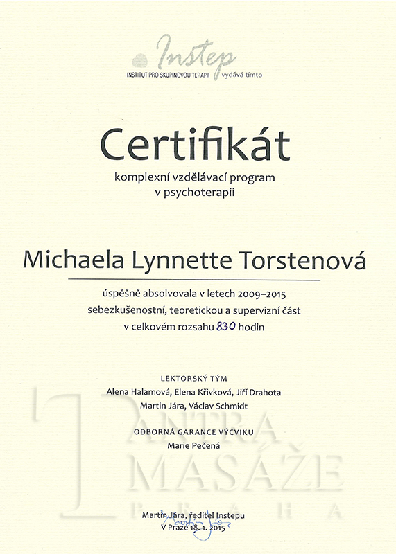 Bc. Michaela Lynnette Torstenová, MBA je zakladatelkou studia Tantra masáže Praha a autorkou terapeutické techniky tantrické masáže Deep Touch®. Má více než dvacetiletou zkušenost s prací s lidmi – jako psychoterapeutka, lektorka tantry, masážní terapeutka, koučka a průvodkyně osobnostního rozvoje. Její přístup propojuje hluboké psychologické vzdělání (mj. výcvik v Gestalt terapii, dramaterapii, analytické psychoterapii) s bohatou praxí v oblasti tělové práce, tantrických a šamanských výcviků, jógy a hlasového umění. Věnuje se výuce tantrických masáží, individuální i párové terapii, koučinku a profesionální supervizi. Michaela je známá svou schopností držet prostor s jemností i pevností, vést lidi k autenticitě a bezpečně je doprovázet na cestě k hlubšímu prožitku těla, sexuality a duše.